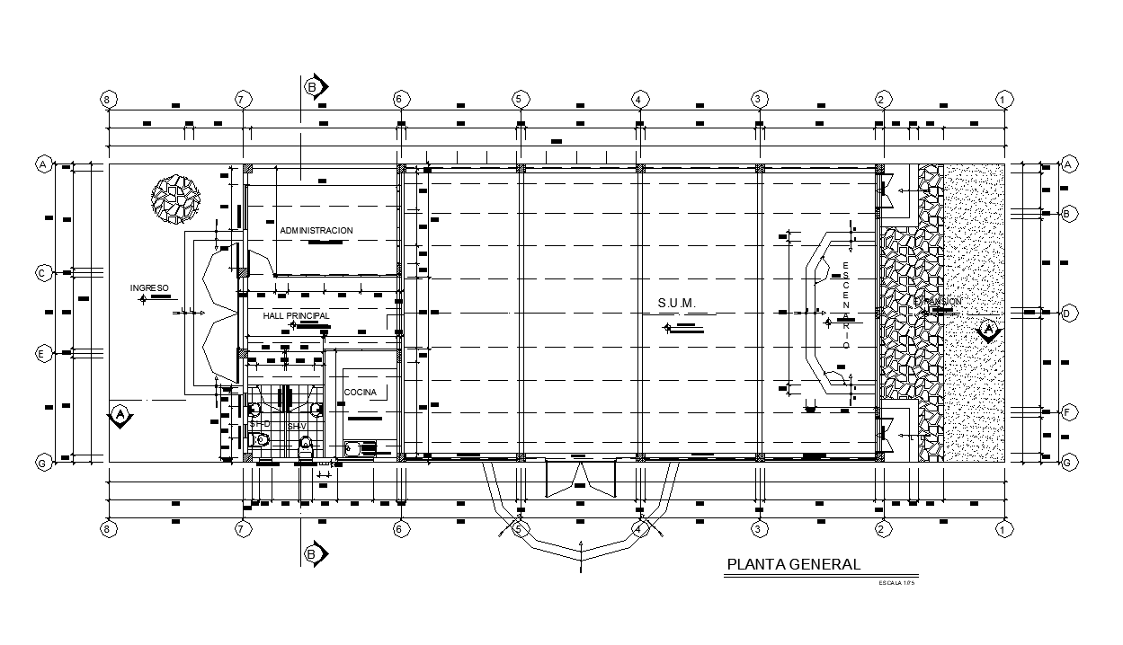 Communal hall detail plan 2d view layout autocad file, plan view detail, wall detail, administration office detail, flooring detail, hidden line detail, sanitary toilet detail, washbasin detail, hall detail, door and window detail, section line detail, numbering detail, scale detail, hatching detail, etc.