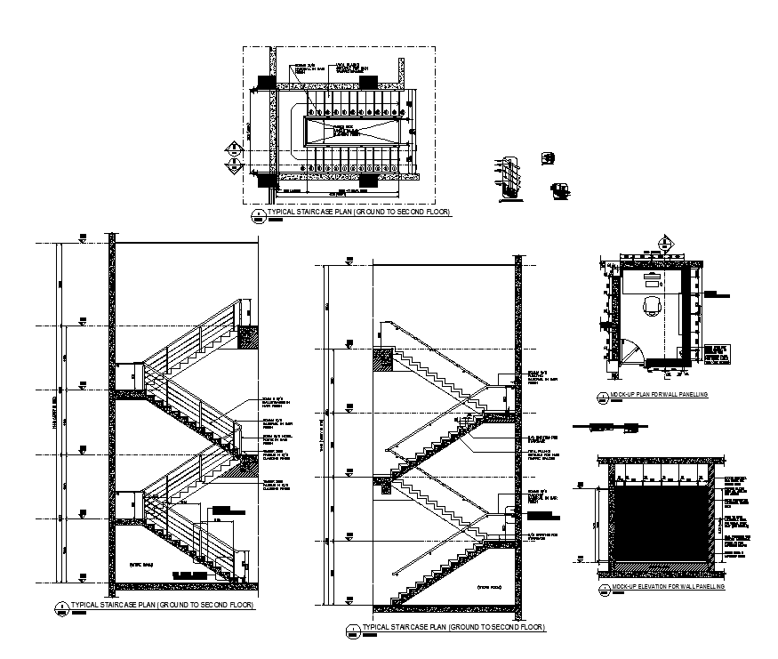 Typical staircase plan and elevation 2d view layout file, railing detail, riser and thread detail, floor level detail, welded connection detail, dimension detail, front elevation detail, hatching detail, top elevation detail, specification detail, section line detail, RCC detail, etc.