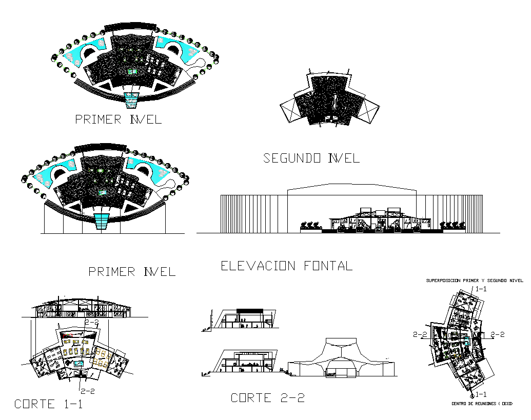 Center of recreational leisure building detail plan, elevation and section layout file, plan view detail, front elevation detail, landscaping trees detail, floor level detail, hatching detail, wall and flooring detail, section line detail, section 1-1 detail, section 2-2 detail, etc.