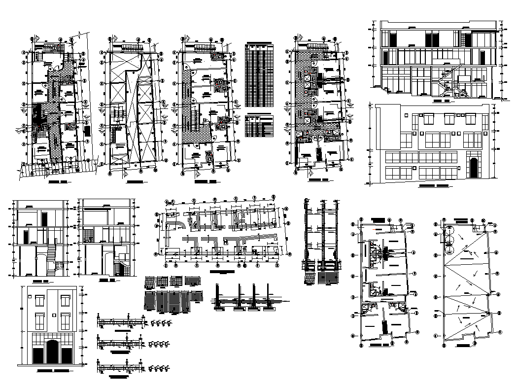 Commercial building CAD structure detail plan and elevation 2d view layout file, wall detail, column detail, flooring detail, plan view detail, floor level detail, hidden line detail, dimension detail, staircase detail, riser and thread detail, railing detail, door and window detail, numbering detail, hatching detail, cut out detail, column detail, wall section detail, reinforcement detail, section line detail, etc.