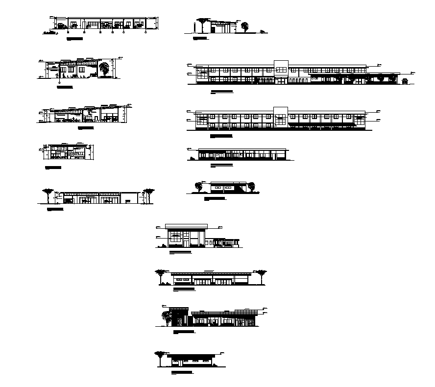 Detail college institute structure 2d view elevation layout file, front elevation detail, wall and flooring detailing provided, landscaping trees detail, door and window detail, right side elevation detail, rear elevation detail, floor level detail, line drawing detail, rear elevation detail, column detail, ground level detail, etc.