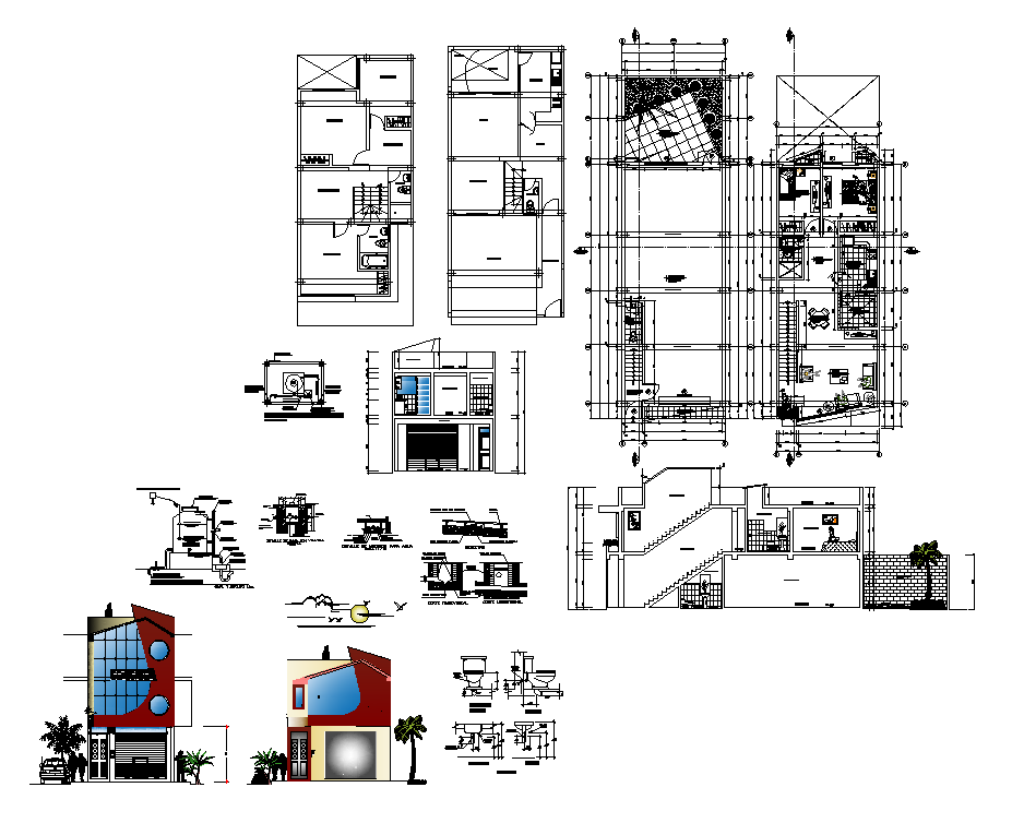 Housing Building plan, elevation and section 2d view layout dwg file, plan view detail, room detail, door and window detail, floor level detail, hidden line detail, dimension detail, staircase detail, riser and thread detail, front elevation detail, wall and flooring detail, vechicle detail, people detail, landscaping trees detail, sanitary toilet detail, bathroom detail, drainage system detail, brick wall masonry detail, etc.