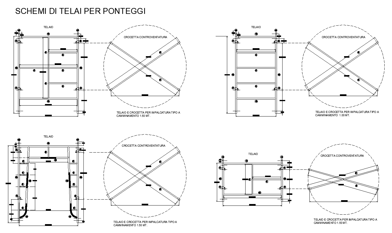 Scaffolding structure detail elevation and sectional layout file, naming detail, numbering detail, dimension detail, struts detail, working platform detail, vertical and horizontal planks detail, wooden structure detail, bolt required for joints connection detail, etc.