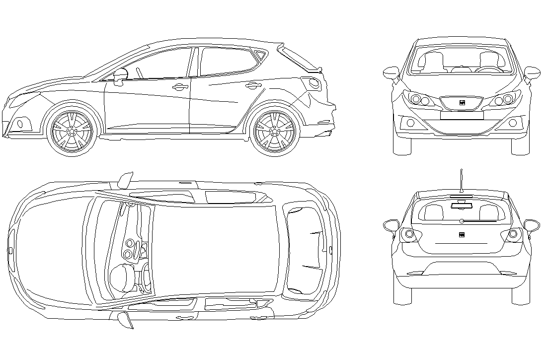 CAD vehicle Car block detail elevation 2d view layout file, door and window detail, line drawing detail, side mirror detail, wheels detail, headlight detail, steering wheels and seat detail, side elevation detail, front and rear elevation detail, etc.