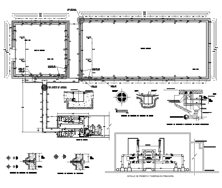 Detail of tube and pipes in trench detailing 2d view layout file, pipe system network detail, hatching detail, naming detail, cut out detail, hidden line detail, ground level detail, valve detail, concrete masonry detail, dimension detail, suvction valve detail, electrical motor detail, cross scetion line detail, tube detail, etc.