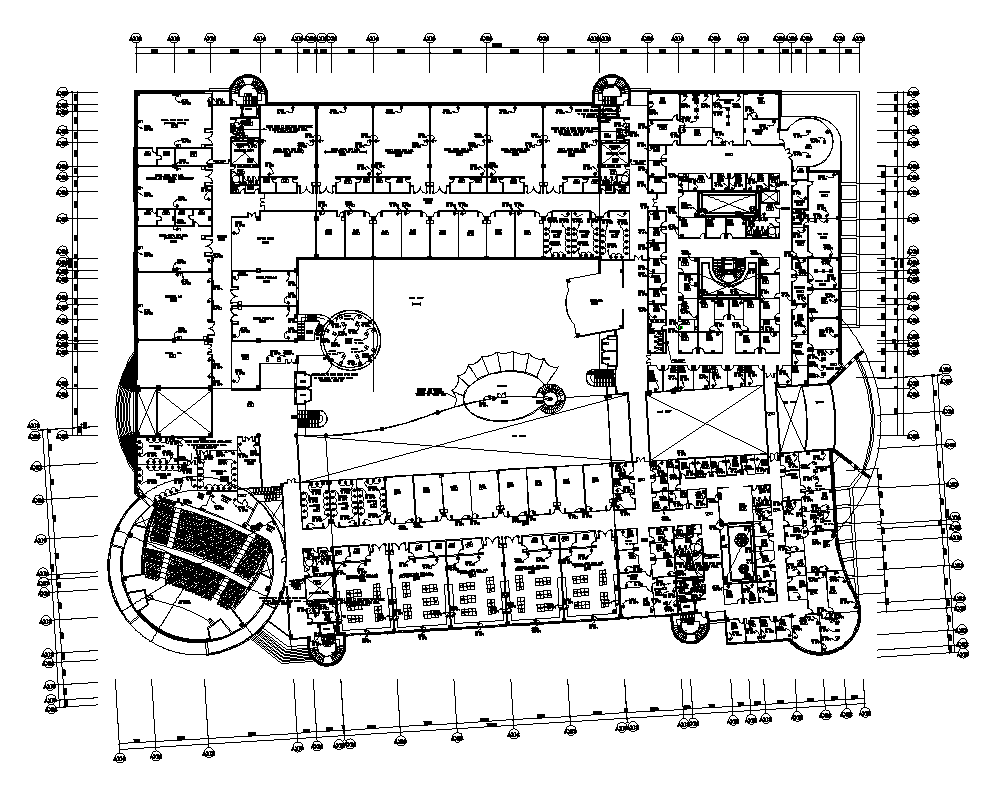 Commerce building detail plan 2d view layout dwg file, wall and flooring detail, staircase detail, parking space detail, RCC structure, door and window detail, hidden line detail, numbering detail, dimension detail, floor level detail, numbering detail, hatching detail, etc.