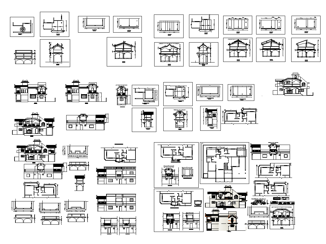 Bungalow building structure detail elevation and plan 2d view layout file in dwg format