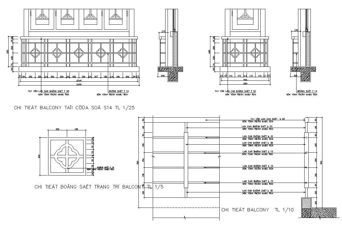 Balcony railing structure detail CAD constructive block layout file in dwg format, front elevation detail, welded and bolted joints and connection detail, design detail, scale 1:10 detail, namings detail, side elevation detail, metallic material structure, dimension detail, cut out detail, foundation detail, hatching detail, etc.