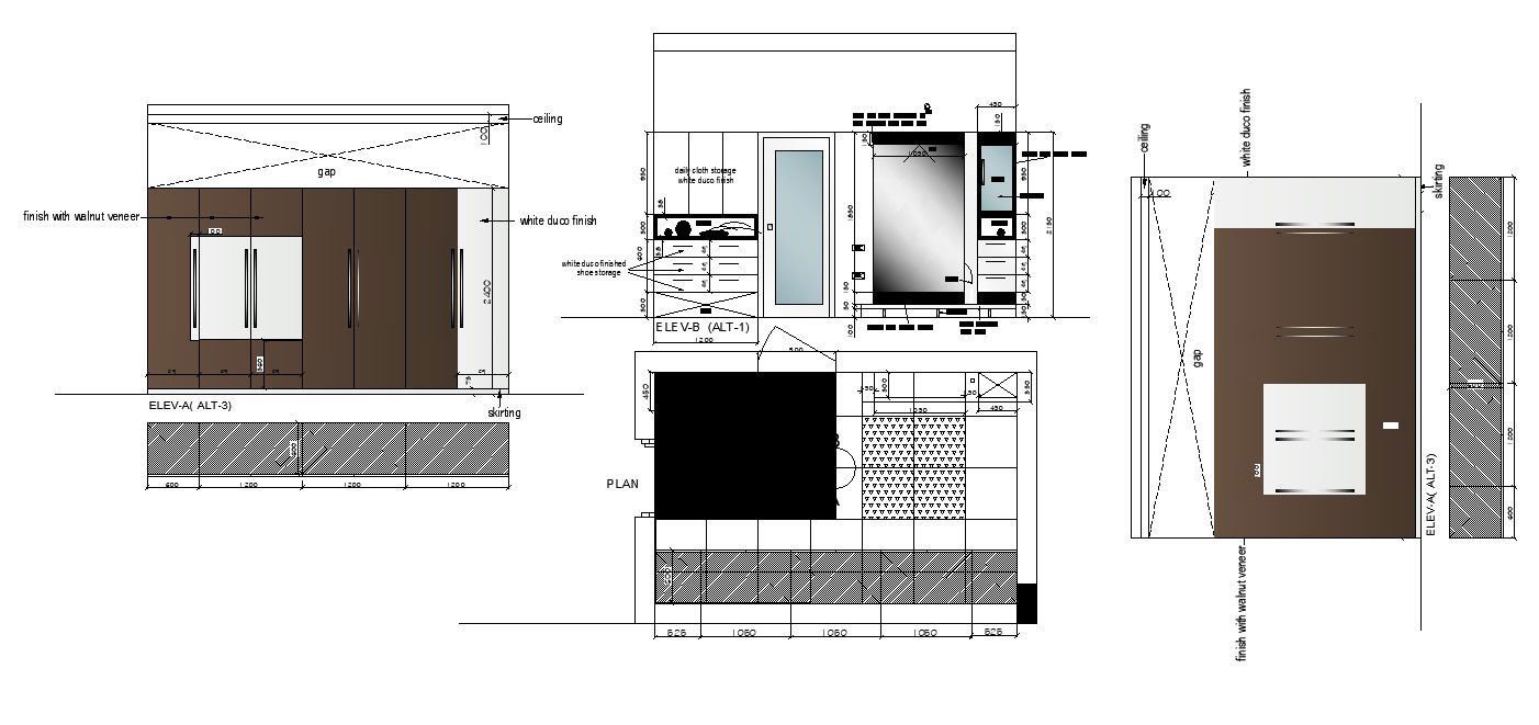 Wardrobe and other furniture blocks arrangement in building CAD block autocad file, plan view detail, dimension detail, wardrobe furniture detail, front elevation detail, door detail, ceiling detail, drawers detail, cabinet detail, etc.