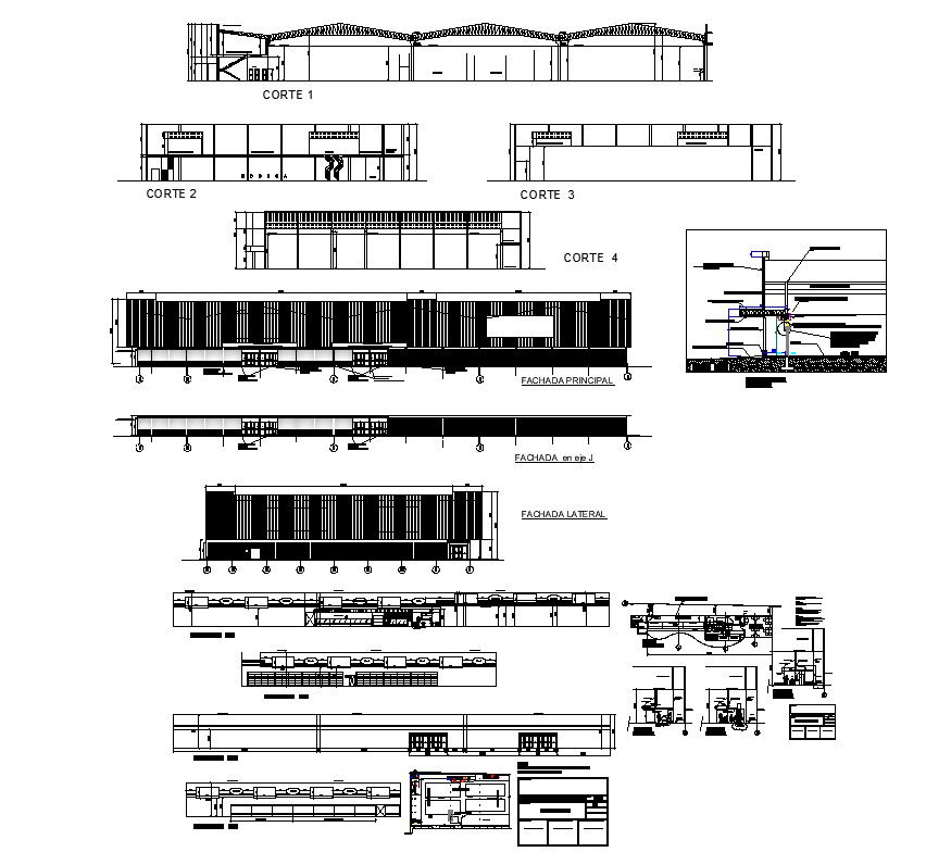 Supermarket Building structure detailing 2d view CAD construction block layout autocad file, plan view detail, ground level detail front elevation detail, side elevation detail, rear elevation detail, section line detail, numberings detail, section 1 detail, section 2 detail, section 3 detail, section 4 detail, dimension detail, etc.