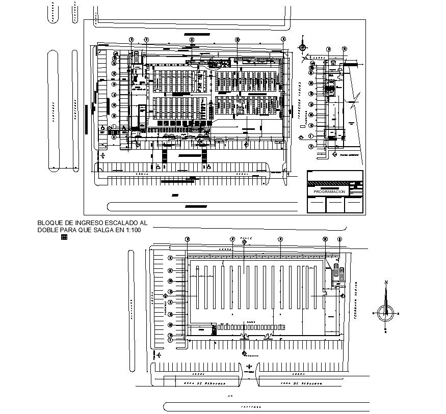 Supermarket building structure detail CAD construction block layout file in autocad format, plan view detail, wall and flooring detail, north direction detail, numberings detail, section line detail, scale 1:100 detail, parking space detail, vehicle detail, cut out detail, floor level detail, etc.