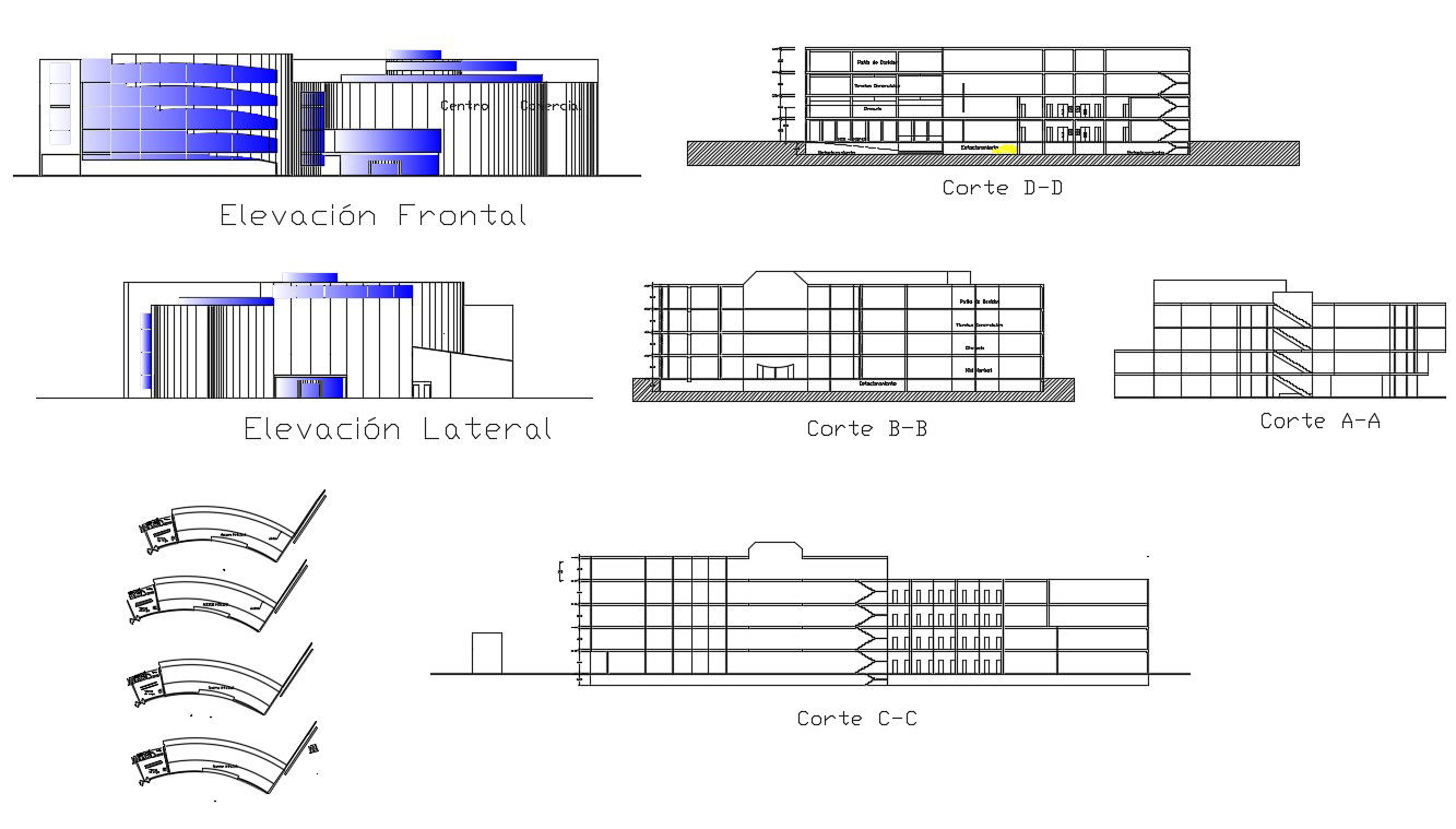 Commercial business center multi-flooring all sided elevation and section details dwg file