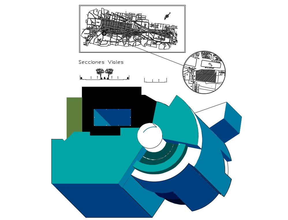 Isometric plan view and layout plan details of commercial complex main entry gate, security check, corporate offices, departmental stores, branded stores, parking floor, loading and transportation trucks parking area, shops and showrooms, elevators, food stores, hotels and restaurants, offices, education centers and much more of commercial complex details.