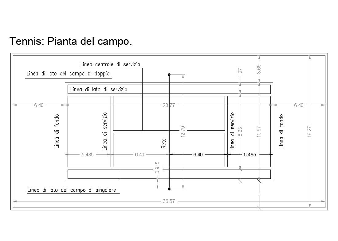 Tennis ground measures cad drawing details that includes a detailed view of Double field side line, Service side line, Central service line, Network, measures details, dimensions details and much more of tennis ground details.