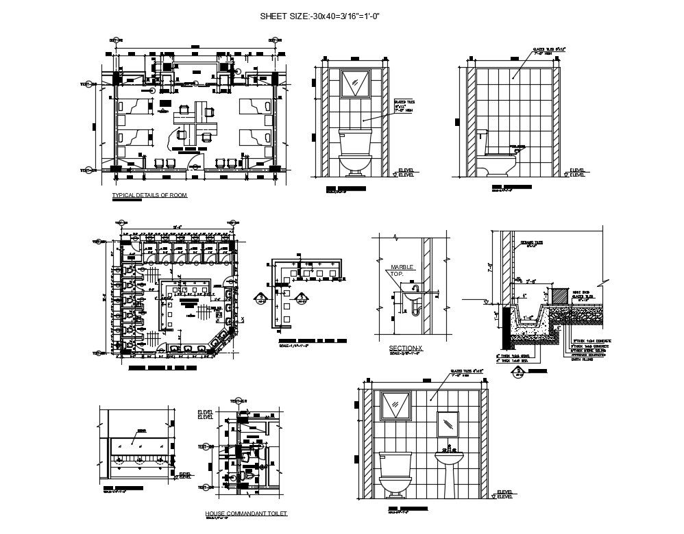 Hotel blocks details of toilet installation and room plan cad drawing details that includes a detailed view of typical details of wash area, wazo area details, section details, bathroom elevation details, toilet equipment details, room plan details, furniture details and much more of hotel details.