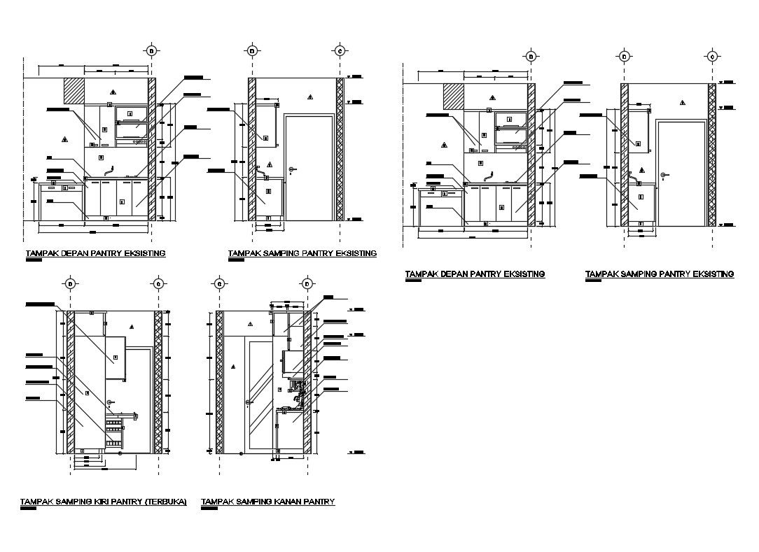 Kitchen existing pantry and furniture plan details that includes a detailed view of door details, kitchen furniture like front view of the existing pantry, next to the existing pantry, dimensions details, cabinet details, sink details, drawers details, crockery stand details, and much more of kitchen details.