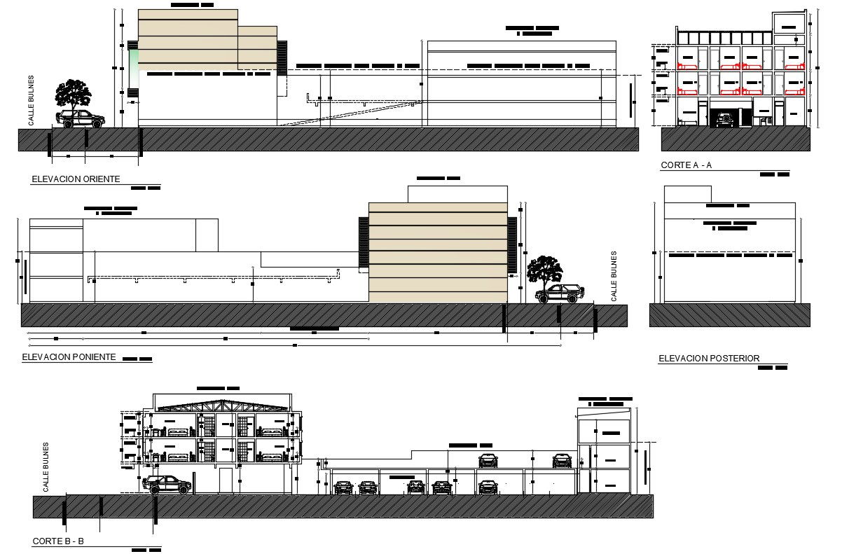 House building main and back elevation with main sectional details that includes a detailed view of flooring view, doors and windows view, staircase view, balcony view, wall design, dimensions, roof or terrace view, car parking view, tree view and much more of house building project.
