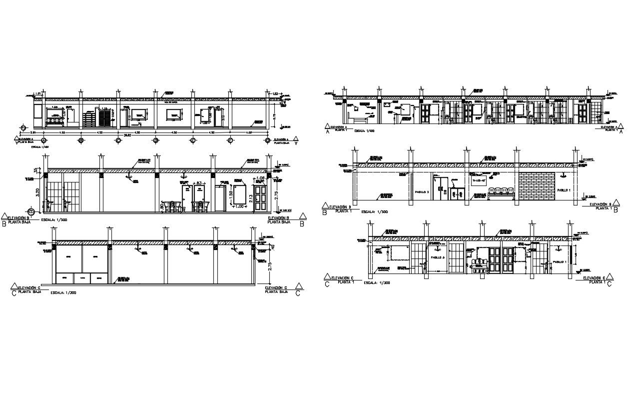 Tourist hotel all sided elevation details with doors and windows car pantry dwg file
