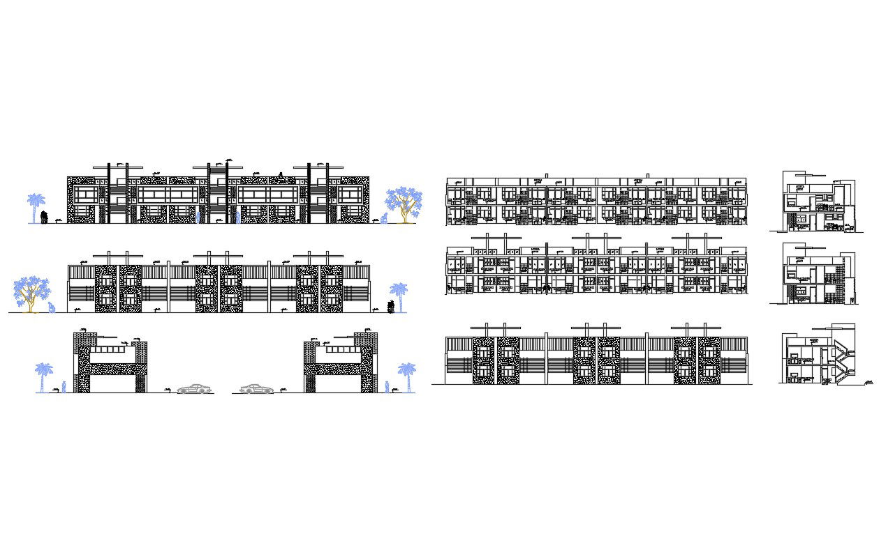 Multi-family apartment building blocks all sided elevation and section details dwg file