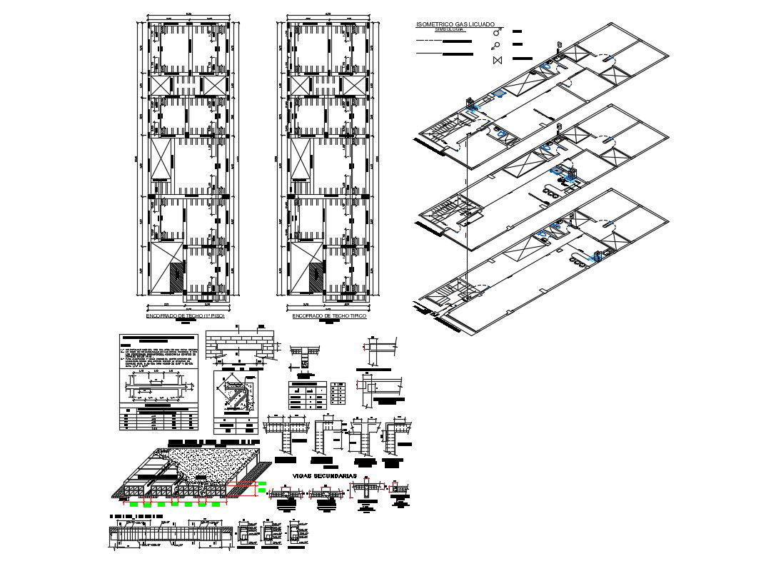 Roof framing, ceiling structure and construction details of house building that includes a detailed view of previously linked support, multilayer insulation panel, rubber shock absorber element, galvanized profile for anchorage, acoustic sandwich. (see detail), dimensions details, memory of materials, concrete details, cuts and joints details, reinforcement details, water proofing details and much more of roof structure details.