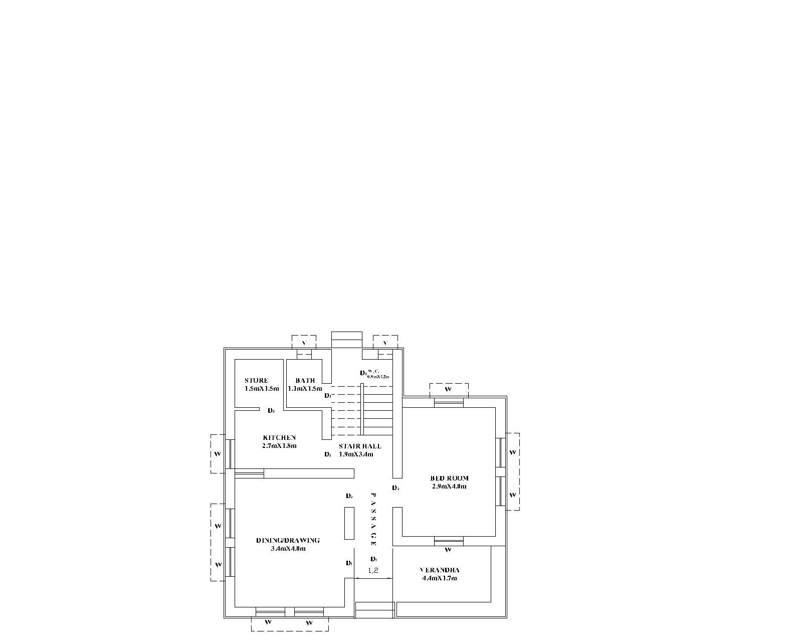 bed room, dinning/drawing room, kitchen, bath room, toilet, stair hall, verandah, free passage. no. of windows 8 & 2 ventilator no. of door 8