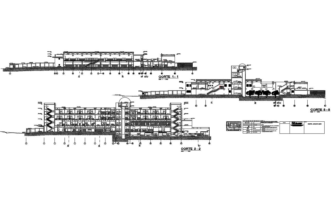 Multi-story hospital building main elevation and section cad drawing details that includes a detailed view of facade back and side elevations and section details with flooring view, doors and windows view, staircase sectional details, balcony view, wall sections and dimensions details, car parking floor, tree view, wall design with specialized departments, operation theater, cleaning departments, pharmacy stores, special and general ward, specimen collection, emergency laboratory, imagenology, laboratories, circumbulatory, waiting rooms, sanitary man, duct, central nursing, sanitary, x-ray, tomography, mastography and desitography, rest area and sanitary, development and printing and much more of hospital project.