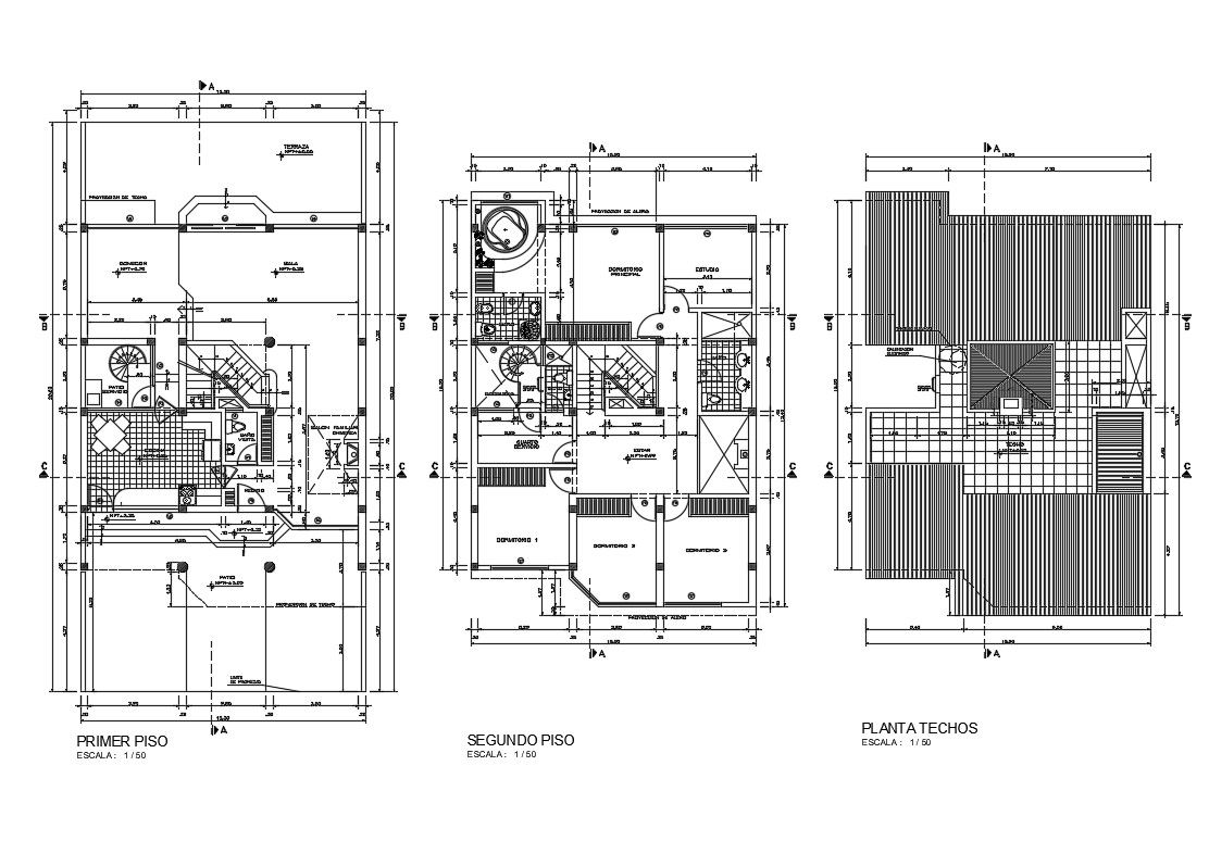 First floor, second floor and cover plan details of one family house that includes a detailed view of ground floor, first floor and terrace with main entry gate, mini garden, car parking view, main entry house door, drawing room, living room, family hall, kitchen, dining area, indoor staircases, laundry area, balcony, bedroom, master bedroom, toilets and bathroom, indoor doors, furniture details and much more of house project.