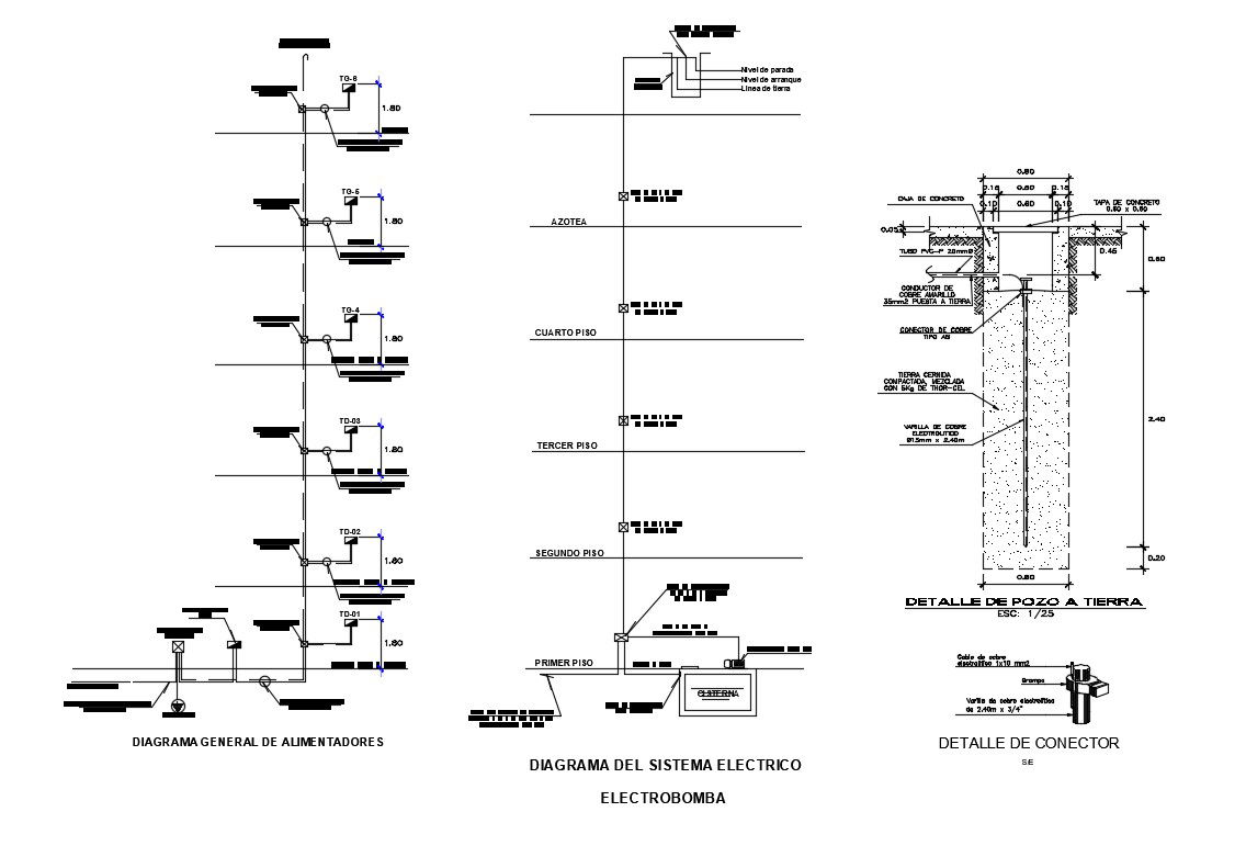 General and electric system diagram with connector cad drawing details that includes a detailed view of power layout details, lighting layout details, computation and schedule of loads, general notes and specifications, panel board details, riser diagram, convienence details, legends and electric equipment details, cable details, dimensions details and much more of electrical installation details.