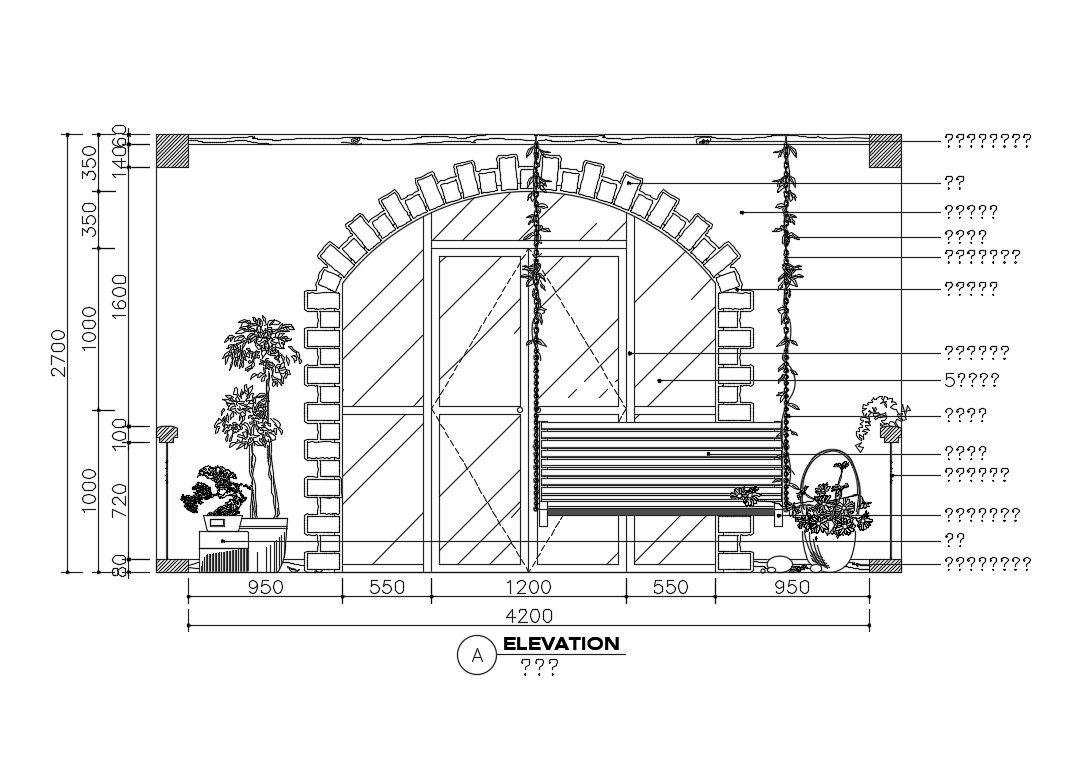 Beautiful outdoor balcony elevation details of house cad drawing details that includes a detailed view of tree and plant blocks, swing view, wall design, dimensions details and much more of balcony details.
