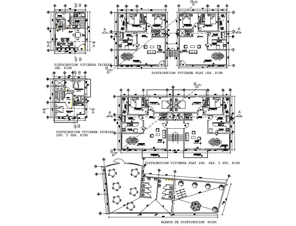 Multi-family residential building distribution plan of duplex, flat, triplex cad drawing details dwg file