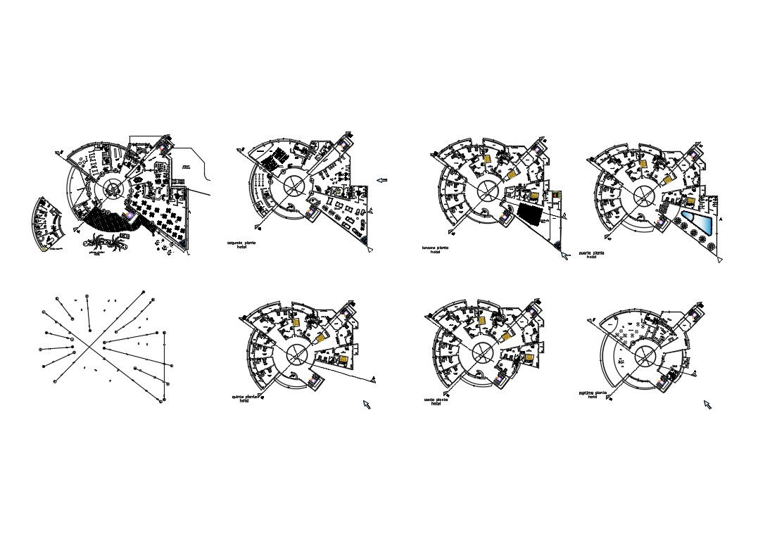 Seven floors layout plan details of multi-family apartment building dwg file