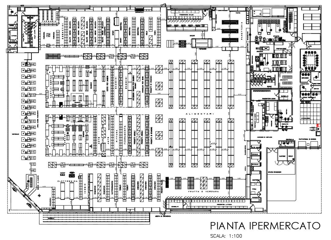 Local hypermarket distribution plan cad drawing details that includes a detailed view of market plant food, plant - supplies, plant - meat and seafood, lift - food, elevation - supplies, elevation - meat and seafood, cut a - a'- food, cut a - a'- supplies, cut a - a'meat and seafood, detail 2 (columns), detail 3 (cover), detail 5 (container), plane of axes and trusses, cut b - b'- food, masonry wall, blocks of 0.39x0.19x0.09 and much more of market project.
