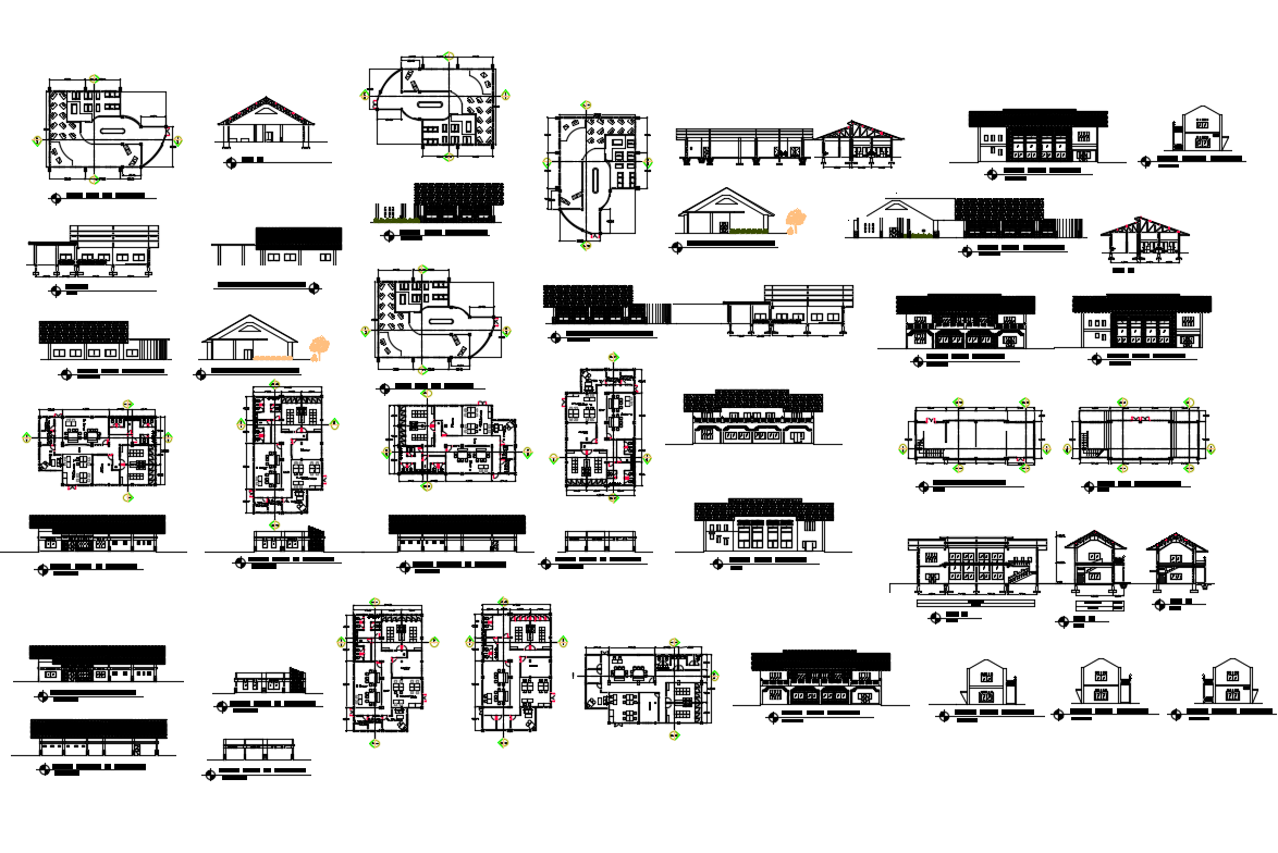 Office building elevation, section, plan and auto-cad details that includes a detailed view of facade back and side elevations and section details with flooring view, doors and windows view, staircase sectional details, balcony view, wall sections and dimensions details, car parking floor, tree view, wall design with reception area, waiting area, cabin, bottom false ceiling, computer lab, bottom of grid ceiling, counselling room and library, conference room, and much more of office building project.
