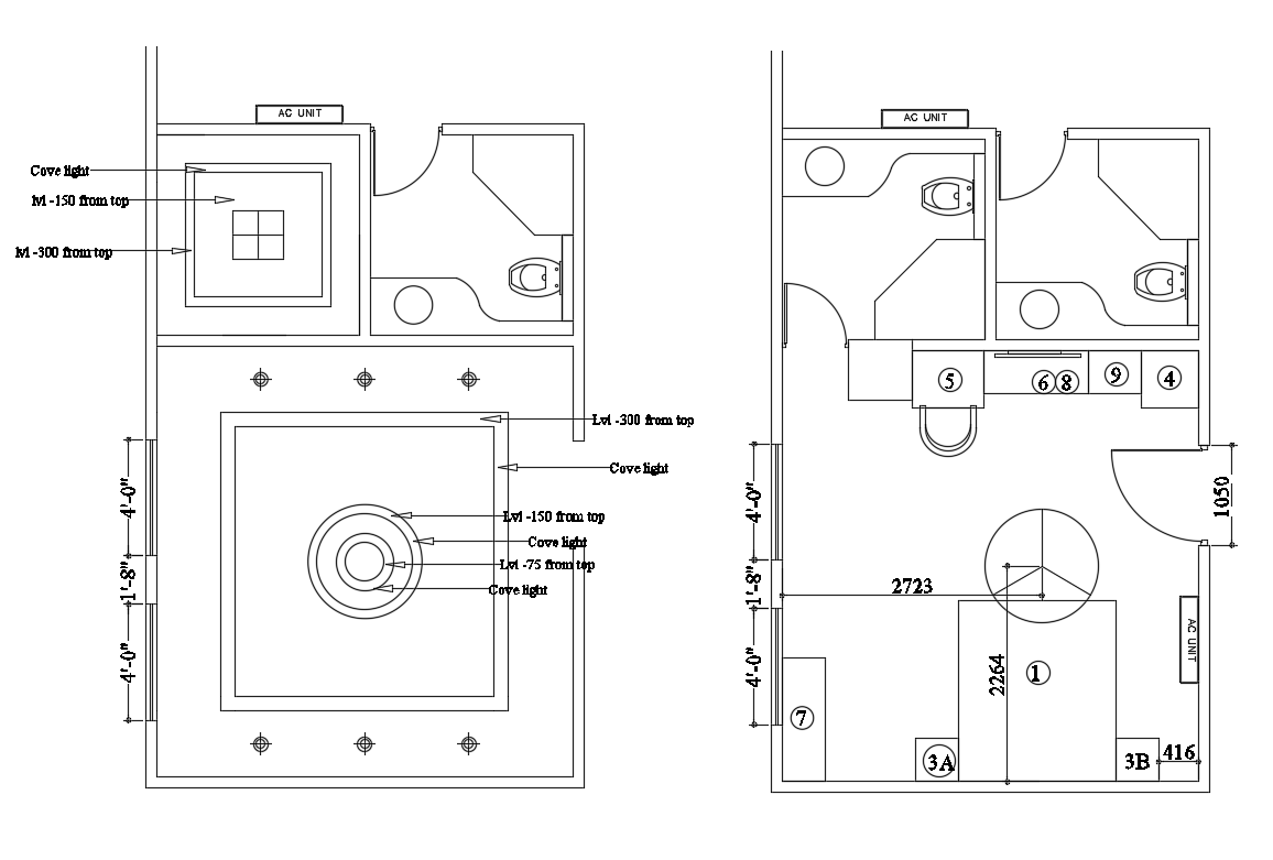 House sanitary plan and installation details with ceiling details that includes a detailed view of toilet plan, floaded elevation of toilet, toilet sections and elevations, doors and ventilations, plumbing details, evc with flush tank, ewc with flush tank, urinals with sensor, wash basin, fd- floor drain, bib cock, health faucet, angle stop cock, piller cock, paper holder, soap dispenser toshi, granite counter, mirror frame, towel rail/ring and much more of sanitary installation details.