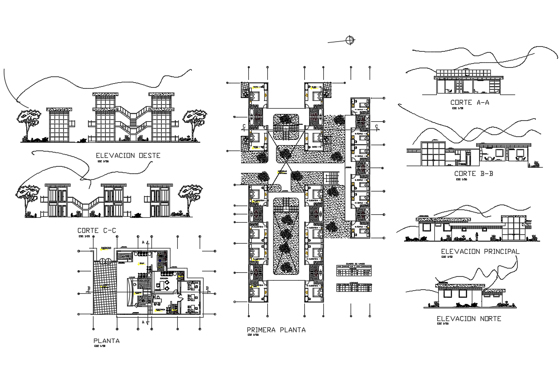 Luxuries hotel elevation, section, plan and first floor plan details that includes a detailed view of facade back and side elevations and section details with flooring view, doors and windows view, staircase sectional details, balcony view, wall sections and dimensions details, car parking floor, tree view, wall design with parking area, outdoor garden, reception area, waiting lounge, dining area, banquet hall, kitchen, cleaning department, staff room, sanitary facilities, furniture details, interior details, laundry department, spa, gym, back yard garden, service area, bedrooms like honeymoon suits, double bedrooms etc, cleaning departments, cafeteria, bar, terrace, elevators and much more of hotel project.