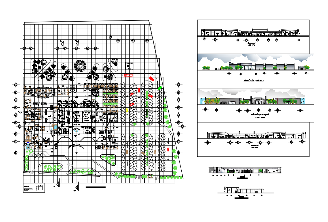 Hospital oncologist all sided elevation section and plan details that includes a detailed view of facade back and side elevations and section details with flooring view, doors and windows view, staircase sectional details, balcony view, wall sections and dimensions details, car parking floor, tree view, wall design with reception area, waiting area, consultant room, specialized departments, operation theater, cleaning departments, pharmacy stores, special and general ward, specimen collection, emergency laboratory, imagenology, laboratories, circumbulatory, waiting rooms, sanitary man, duct, central nursing, sanitary, x-ray, tomography, mastography and desitography, rest area and sanitary and much more of hospital project.