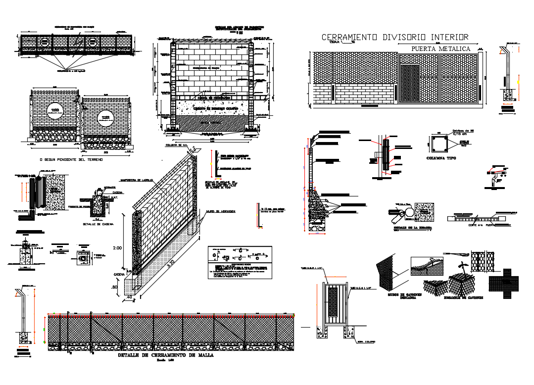 Fence elevation, section and construction cad drawing details that includes a detailed view of front elevation view, brick wall view, sectional details, dimension details, detail of picaporte to the floor, detail of hinge fixing, detail of picaporte cerrojo, horn, picaporte, anchored horn and much more of fence details.