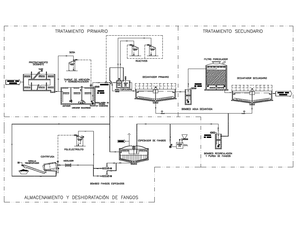 Storage and dehydration of sludge cad plumbing details that includes a detailed view of primary treatment, secondary treatment, aeration and homogenization tank, secondary decanter, percolator filter, decanated water pumping and much more of plumbing details.