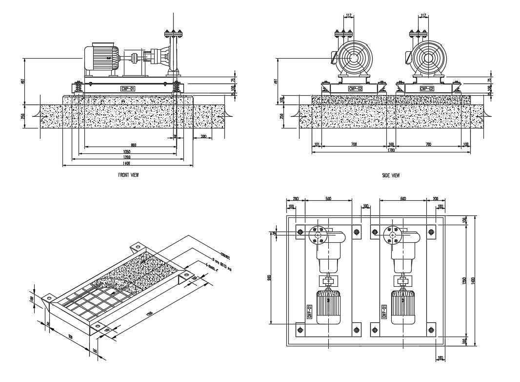 Pump house with motor pump cad drawing details that includes a detailed view of sectional details, pump installation details, machinery details, dimensions details, electric installation details, wire details and much more of pump house details.