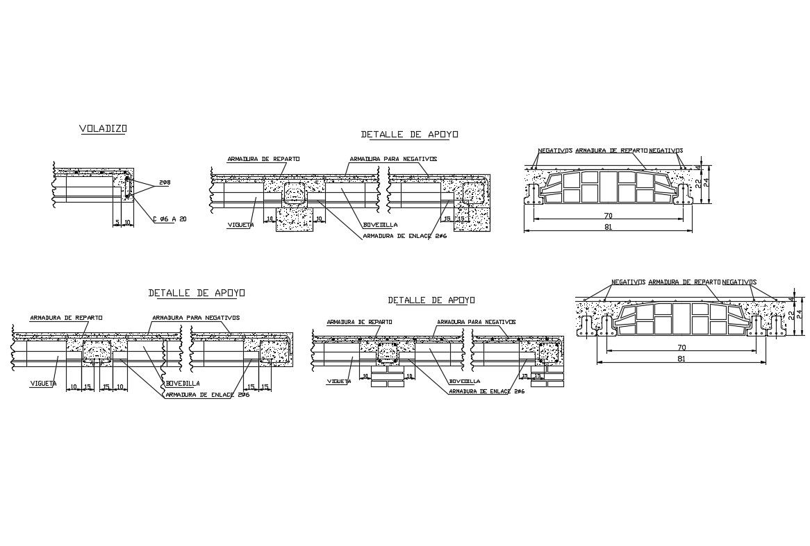 Floors support of wrought cad construction details that includes a detailed view of wall construction, memory of materials, footings details, column view, beam construction, covers closure type, soil burried wall closure , exterior solera, holes, interior partition, granite veneer of the country with steel supports, halfeneisen type, Brick partition, plaster plastering, Concrete wall and much more of construction details.