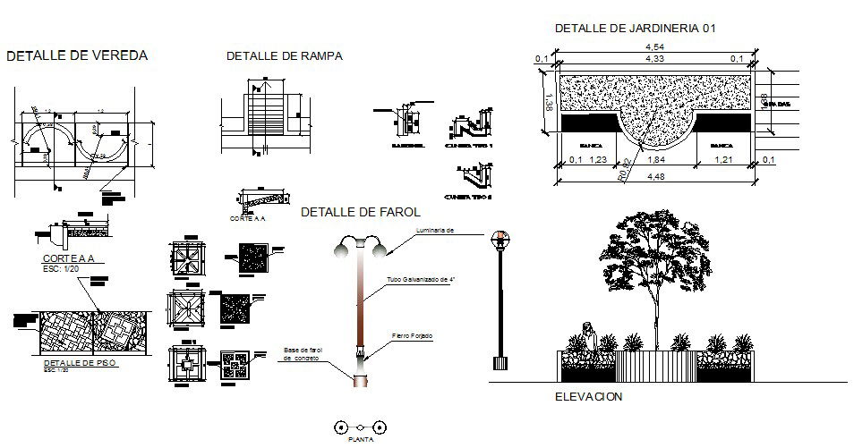 Multiple garden furniture cad drawing details that includes a detailed view of garden bench elevation, section and plan details, foundation details, light pole details, landscaping details, dimensions details, tree view and much more of garden details.