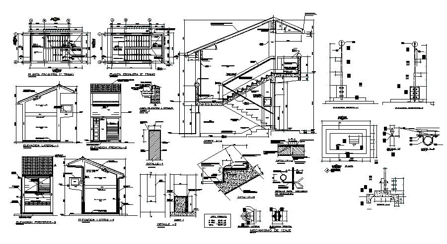 Staircase and several construction details of school that includes a detailed view of foundation plan, structure details, floor construction, beam construction, floor wise structure and constructive details with memory of materials, footings details, staircase construction and sectional details, steps details, dimensions, column view, beam construction, covers closure type and , soil burried wall closure type and , exterior solera, holes, interior partition, granite veneer of the country with steel supports and much more of school details.