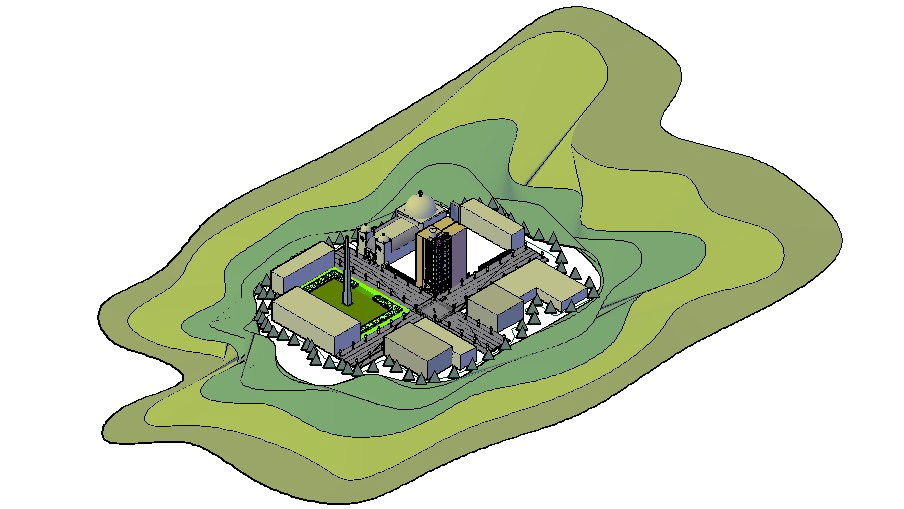 Multi-story 3d apartment building cad drawing details that includes a detailed view of flooring view, doors and windows view, staircase view, balcony view, wall design, dimensions, roof or terrace view, car parking view, tree view, landscaping view, and much more of building details.