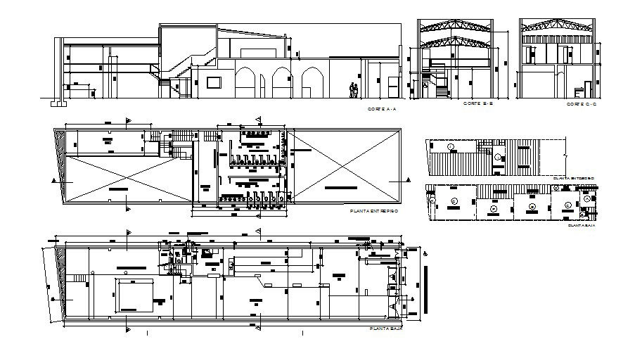 Cultural hall with dance class elevation, section and plan details that includes a detailed view of facade back and side elevations and section details with flooring view, doors and windows view, staircase sectional details, balcony view, wall sections and dimensions details, basement car parking floor, tree view, wall design with basement car parking floor details, children play area, common lobby, theater, passage, display area, shopping plaza department, green space, gallary, theme restaurant, viewing gallery, kitchen, waiting area, open space, sanitary facilitites and much more of center details.