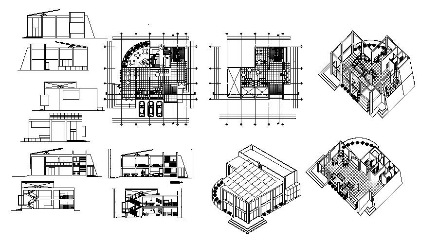 Snack bar restaurant all sided elevation, section, plan and auto-cad details dwg file