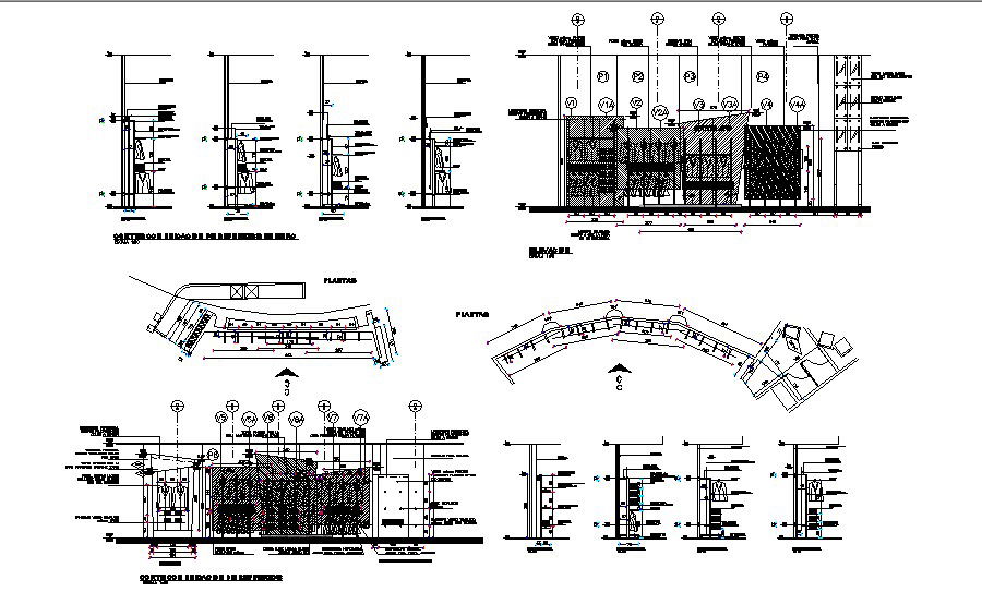Multi-level shopping mall building all sided elevation and constructive sectional details dwg file