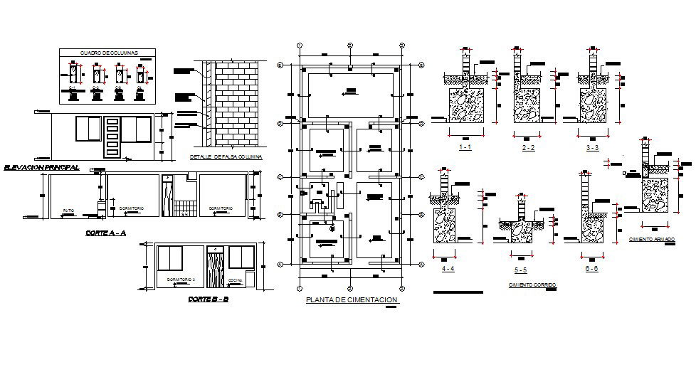 Foundation plan, section and constructive details with column of house that includes a detailed view of the foundation, side typical shoe, typical central shoe, columns, foundations, shoes, cistern tank, walls of concr. arm., beams flat, peralted beams, foundation beams, (cement: sand: crushed stone), typical detail of reinforcement and ended of walls of masonry, detail of cistern, cure the concrete by wet way minimum 7 days, - avoid splices and overlaps in areas of maximum effort and much more of house details.
