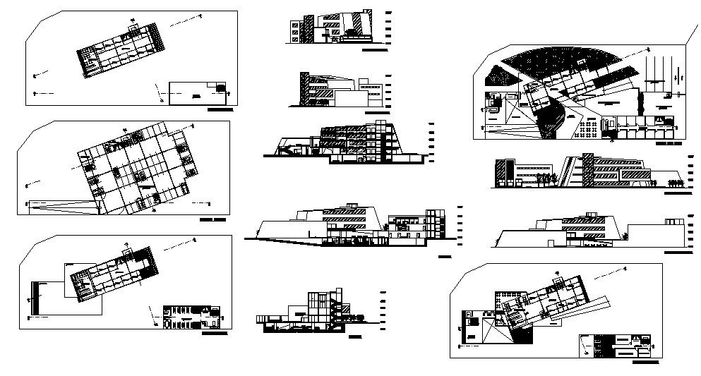 Multi-story hotel building all sided elevation, section, plan and auto-cad details dwg file