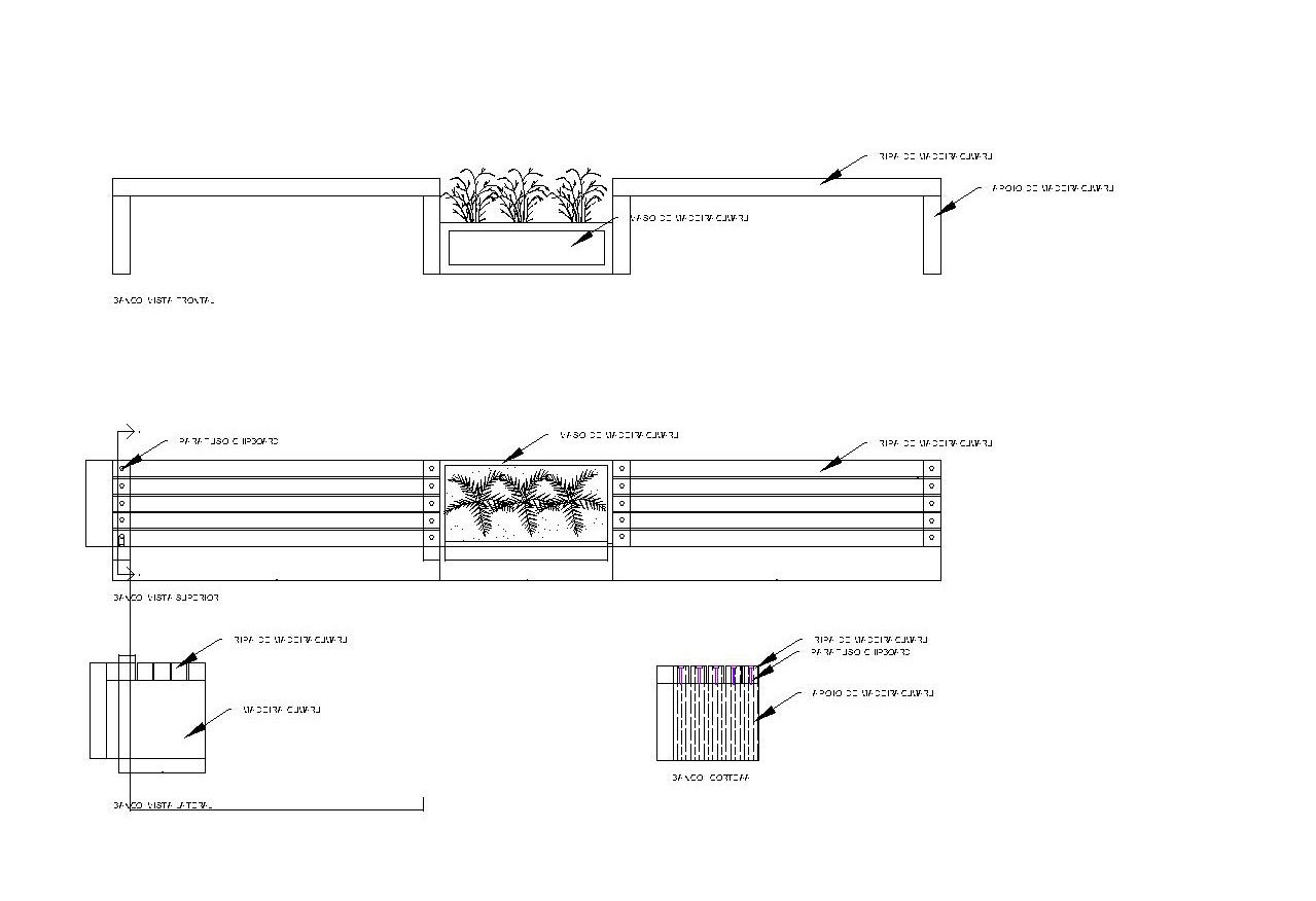 Detalhamento de um banco de madeira, usado em praças e espaços externos. Possui planta, corte e elevações