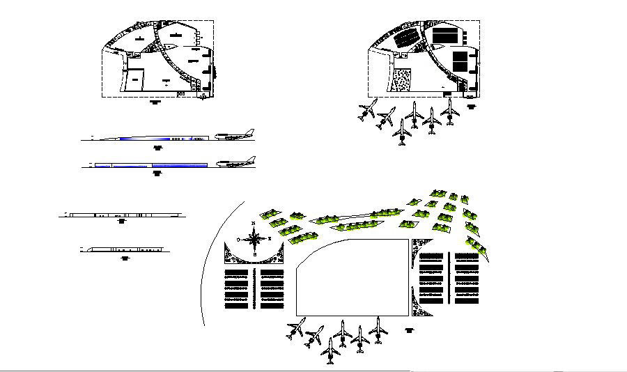 Airport elevation, section, plan and auto-cad details that includes a detailed view of facade back and side elevations and section details with flooring view, doors and windows view, staircase sectional details, balcony view, wall sections and dimensions details, car parking floor, tree view, wall design, multiple entry doors of different terminal, car parking area, indoor and outdoor garden area, main entry gate of airport with security check, waiting area, seating lounge, boarding gates, ticket counters, shopping areas with shopping branded stores, food stores, cafeteria, toilets for male and female, luggage room, car parking area, main waiting area hall, runway details, airplane view, interior details, furniture details, runways, transportation truck and much more of airport plan details.
